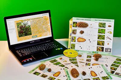 Образцы (шишки, плоды и семена дуба, березы, сосны, лиственницы, можжевельника) закреплены на картонных планшетах формата А4 с антибликовой пленкой, сопровождаются фотографиями растений. Ботанические описания и другие дополнительные сведения приведены в приложении. Пособие подходит для самостоятельного и коллективного изучения.