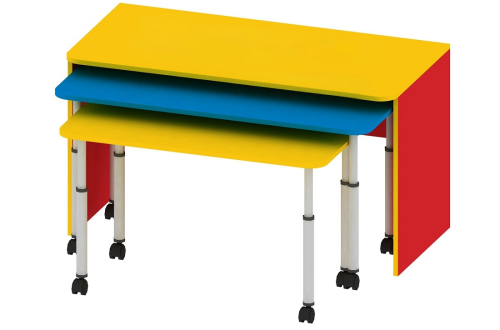 Компактный многофункциональный модуль с выкатными столами предназначен для развивающей деятельности со стационарным тумбой-столом и двумя столами которые помещаются внутри тумбы-стола. Каждый стол предназначен для 2 детей, благодаря разной размерности столов можно использовать их для детей разного роста. Колеса оснащены специальными стопорами для предотвращения произвольного движения. Такой модуль удобно использовать в небольших помещениях для экономии пространства игровой зоны в дошкольных образовательных учреждениях. Опоры регулируемые 400-580