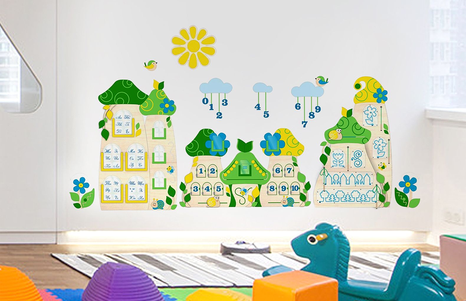 Бизиборды в виде домиков оснащаются кармашками для прописей, образцов рисунков, шаблонов. Фигурные элементы в виде тучек, солнышка, птиц, цветочков дополняют фон тематических панелей. К тучкам прикрепляются нити с капельками-цифрами. Оборудование подходит для кабинета психолога, логопеда или рекреационной зоны ДОУ.