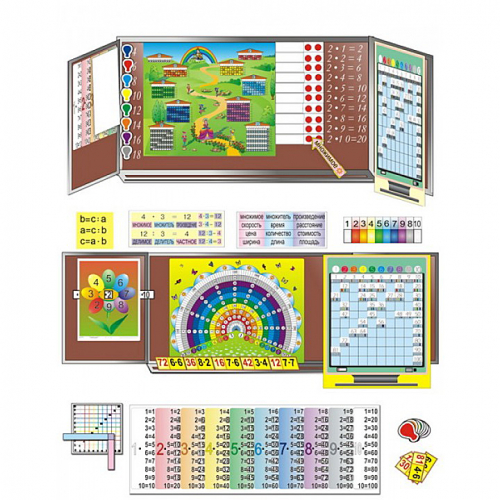 - демонстрационные пособия для доски (ДхШ): Таблица умножения (580х890 мм). Город умножения (880х1030 мм, с домиком). Таблица с цветовым кодом (1130х880 мм). Радужный цветок (880х1130 мм). Цветик-семицветик. Компоненты и результаты действий умножения и деления. Домино. Абак (750х880 мм).