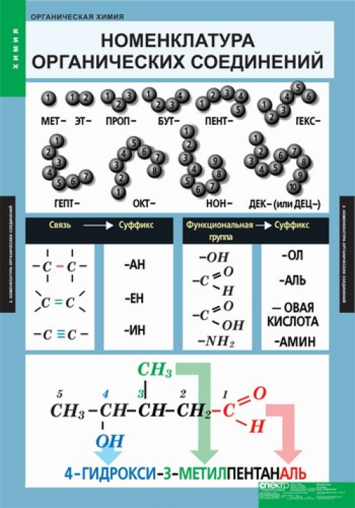 | В комплект входят 7 полноцветных плакатов | Номенклатура органических соединений;, Предельные углеводороды;, Непредельные углеводороды;, Функциональные производные углеводородов;, Структурная изомерия;, Пространственная изомерия;, Гомология |