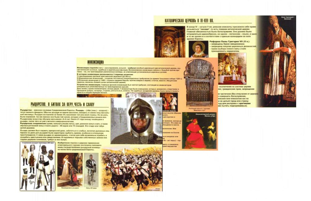 Набор таблиц по истории средних веков производится типографским способом, на плотной бумаге. Раздаточные материалы представлены иллюстрациями и статьями на тему: