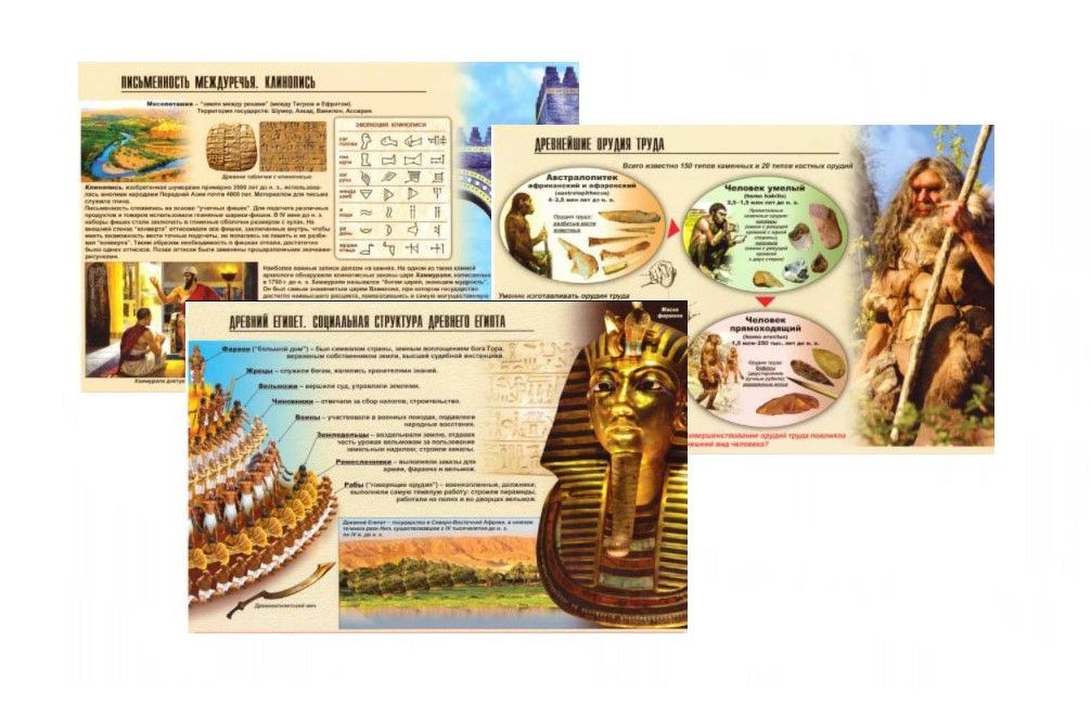 Набор полноцветных учебных плакатов производится типографским способом, на плотной бумаге, используется учащимися 6-7 классов. В комплект раздаточных материалов для кабинета истории входят пособия с иллюстрациями и статьями на тему: