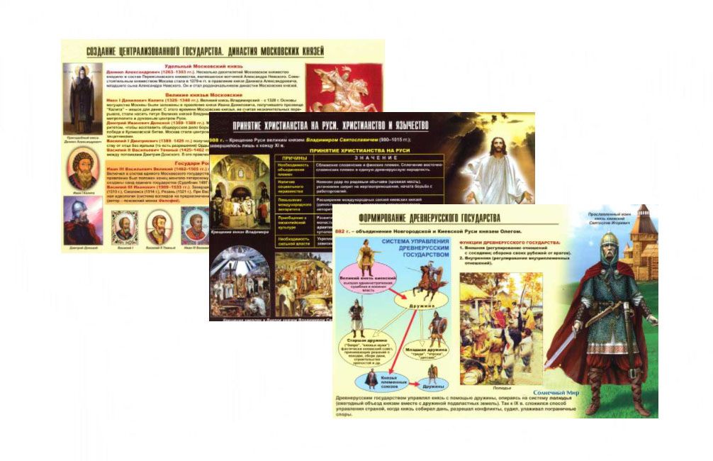 Набор полноцветных таблиц производится типографским способом, на плотной бумаге. Раздаточные материалы для кабинета истории представлены иллюстрациями и статьями на тему:
