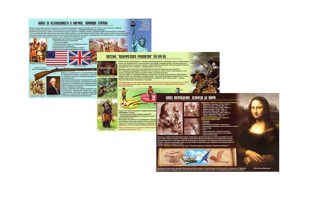 Набор таблиц производится типографским способом, на плотной бумаге с полноцветной печатью. Раздаточные материалы для кабинета истории представлены иллюстрациями и статьями на тему: