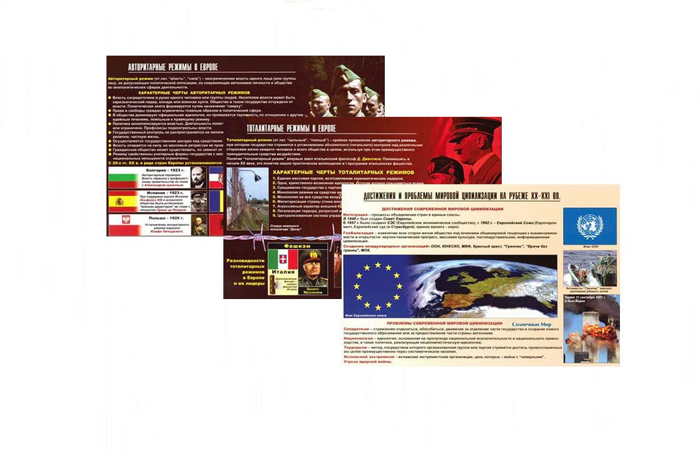 Комплект наглядных таблиц производится типографским способом, на плотной бумаге с полноцветной печатью. Раздаточные материалы для кабинета истории представлены иллюстрациями и статьями на тему: