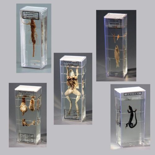 Препараты изучаются на уроках природоведения, практических и лабораторных занятиях по биологии. Каждая коробка подписана, сопровождается паспортом. Образцы можно рассмотреть со всех сторон, изучить составляющие. Стеклянные пластины с препаратами помещены в консервирующую жидкость. Сосуды закрыты крышками.