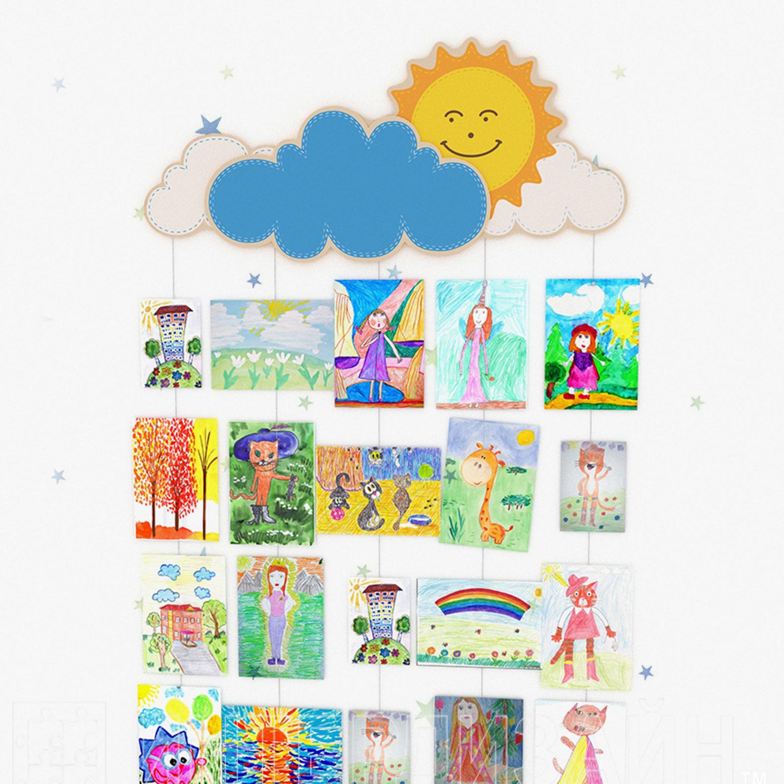 Настенная система для демонстрации рисунков или фотографий представлена фигурными панелями и креплениями. Листы держатся на тросах с прищепками, монтажные аксессуары поставляются с набором.
