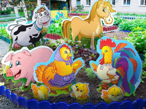 Яркие фигуры изготовлены в виде цыплят, курицы и петуха, свиньи, коровы, лошади. Закрепляются на металлических стойках. Помогут научиться различать сельскохозяйственных животных.