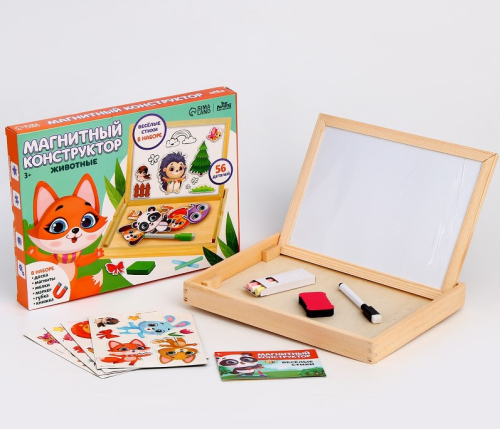 Конструктор подходит для развивающих и коррекционных занятий. С набором можно играть как в помещении, так и на улице. Крышка коробки притягивает магнитные элементы: на ней выкладывают геометрические фигуры, составляют цифры в примеры, делают пометки маркерами. С оборотной стороны поверхность грифельная. Здесь ведут записи и рисуют мелками.