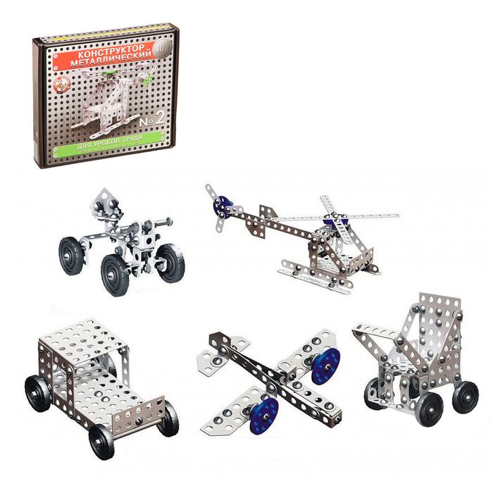 В наборе косынки, колеса, скобы, ключи, пластины. Приводится схема сборки 5-ти моделей (машина, самолет, коляска, велосипед, вертолет).