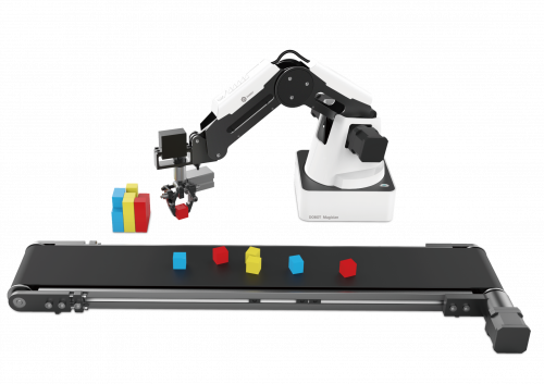 Конвейерная лента предназначена для использования в сочетании с роботизированным манипулятором DOBOT Magician. С помощью ленты можно смоделировать небольшую производственную линию. Датчик цвета позволяет различать красные, синие и зеленые объекты. Набор деревянных блоков предназначен для демонстрации захвата, перемещения и складирования.