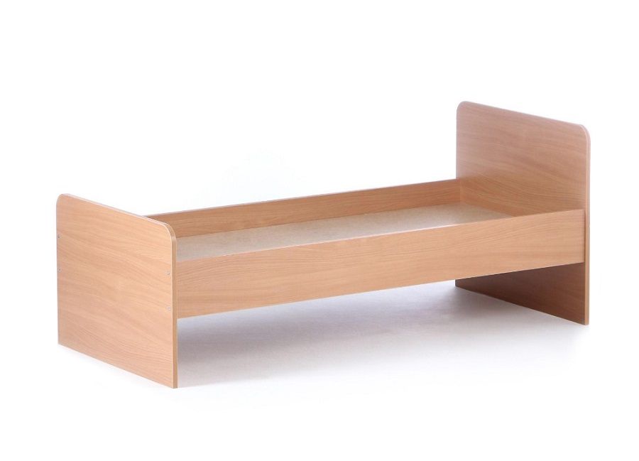 Кровать с опорами из ЛДСП размещается в группе детского сада. Изготовлена из высококачественных и нетоксичных материалов, имеет спинки со скругленными краями.