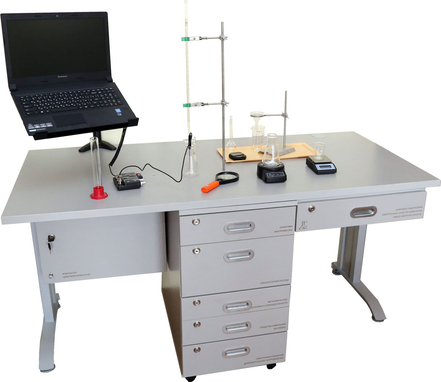 Под столешницей есть выдвижной ящик и отделение для лабораторного оборудования с дверцей. Дверца и ящик с фурнитурой запираются на замок. Напольная тумба состоит из пяти выдвижных ящиков, которые также закрываются на ключ.