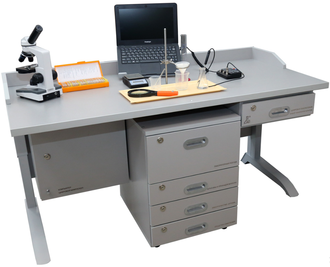 Представляет собой лабораторный стол со встроенными отделениями, в которых размещается оборудование и принадлежности для проведения опытов. Каждое отделение стола подписано в соответствии с разновидностями наполнения и запирается на ключ.