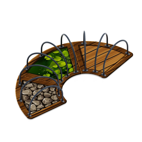 Лаз с перекладинами выполнен в виде ручейка. Визуально разделен на три зоны: настил под дерево, имитация водной поверхности с кувшинками и изображение камней.