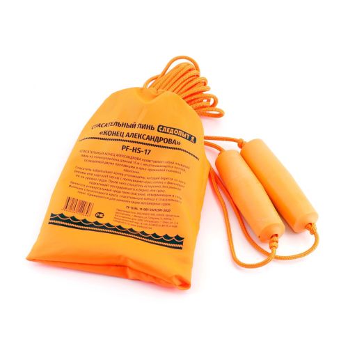 Спасательный конец Александрова представляет собой полипропиленовый плетеный шнур положительной плавучести, диаметром не менее 6 мм и длиной не менее 15 м, с двумя поплавками из твердого пенопласта, окрашенными в ярко-оранжевый цвет. Оснащен малой и большой петлями.