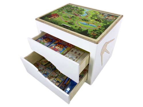 Помимо классических методик представлена настольная игра, которая расположена на крышке куба и помогает в игровой форме развивать правильное звукопроизношение и отрабатывать автоматизацию звуков и слогов. Стол с подсветкой для песочной терапии помогает снять стресс и эмоциональное напряжение, развить мелкую моторику и творческое мышление