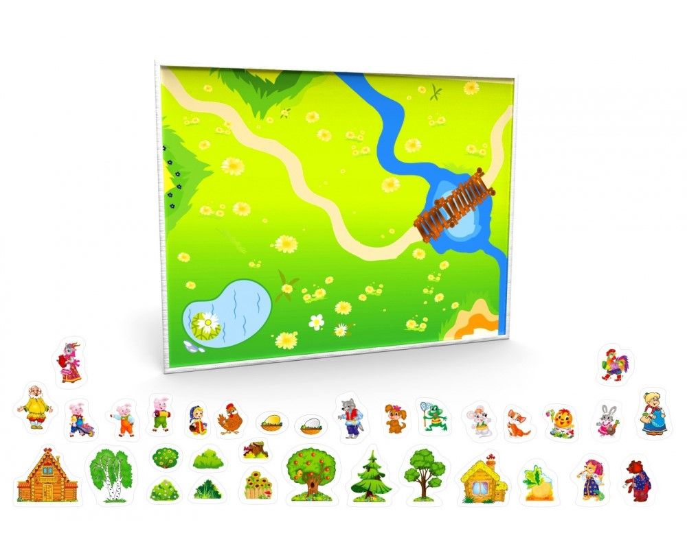 Пособие рассчитано на 12 народных сюжетов. Фигурные магниты с изображениями домиков, деревьев, сказочных персонажей перемещают по цветному фону. Элементы не расслаиваются, выдерживают эксплуатацию без сколов. На доске можно закреплять дидактические таблички или рисунки.