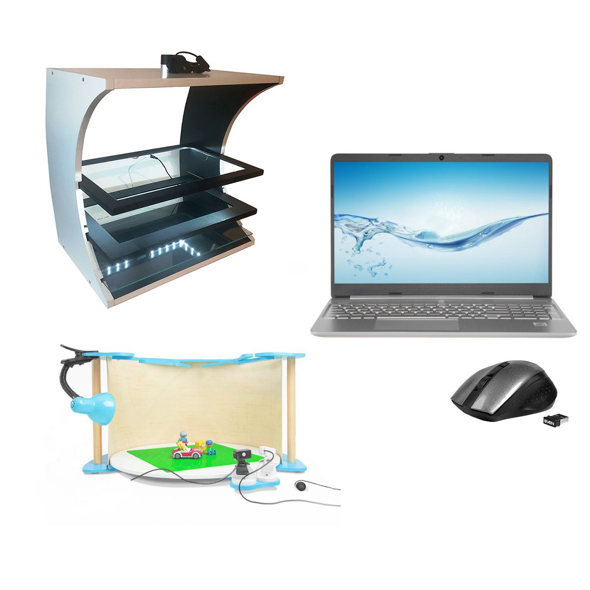 Лаборатория составлена из 2-х видов мультстудий и дополнена специальным ПО. Ноутбук необходим для монтажа и редактирования видео.