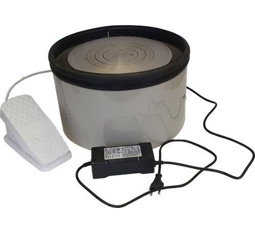 Данная модель гончарного круга удобна для транспортировки. Встроенный аккумулятор обеспечивает до двух часов работы без подзарядки. Мощность двигателя позволяет отцентровать до 3 кг глины. Регулировка скорости осуществляется посредством педали. Гончарный круг подходит как для правшей, так и для левшей.