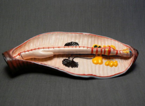Модель изображает увеличенную переднюю часть тела дождевого червя, вскрытого со спинной стороны, состоит из двух частей: кожно-мускульного мешка и съемного участка пищеварительного тракта.