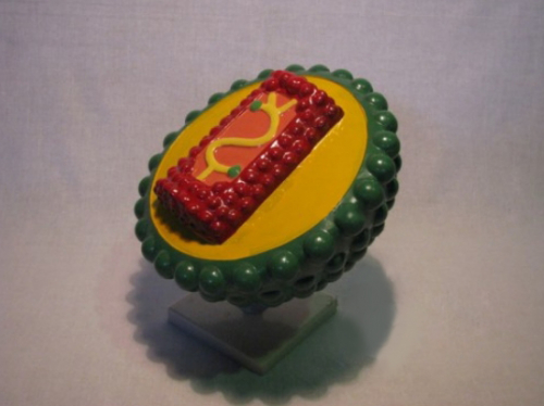 Модель окрашена в контрастные цвета, что позволяет детально рассмотреть на ней особенности строения вируса, для демонстрации устанавливается на пластмассовую подставку.
