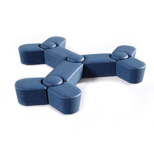 Модули разных конфигураций выстраиваются в цепочку. Каркас каждого пуфа оклеен ППУ и обтянут  чехлом, который дезинфицируется и моется без последствий. Высота пластиковых опор составляет 25 мм.