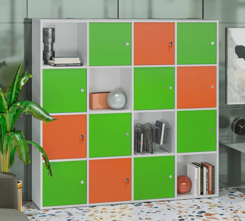 Состоит из 4-х секций и 16-ти ячеек. Размещается на регулируемых опорах М6 с забивной футоркой. Торцевые части изделия покрыты ПВХ-кромкой. Фасады оснащены замками и открываются автоматически при повороте ключа посредством петель с пружиной обратного хода.
