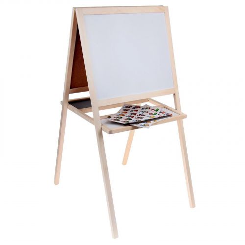 У мольберта для письма и рисования 2 рабочие поверхности: меловая и магнитно-маркерная.  Очищаются влажной губкой. Конструкция опирается на 4 ножки, поля расположены под углом. Канцелярия  помещается на нижнюю полку. Прямоугольные отделения есть с обеих сторон.