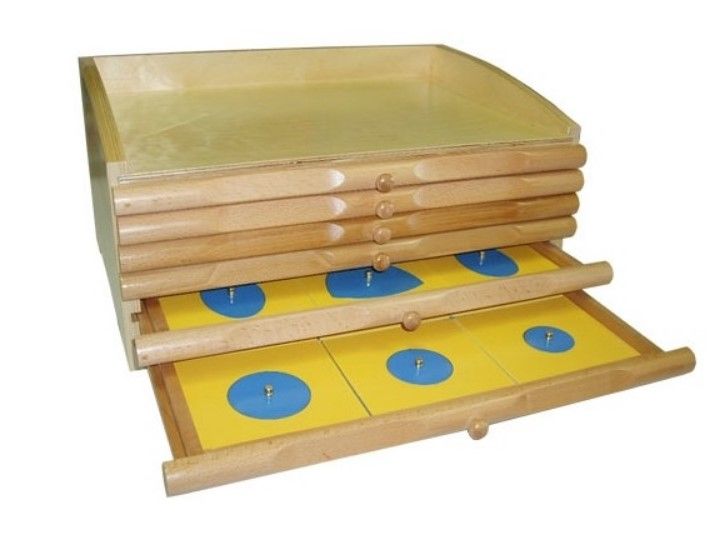 6-ярусный комод оснащен ручками для выдвигания. Ребенок самостоятельно изучает рамку на каждом ярусе. Необходимо заполнить отверстие подходящей геометрической фигурой.