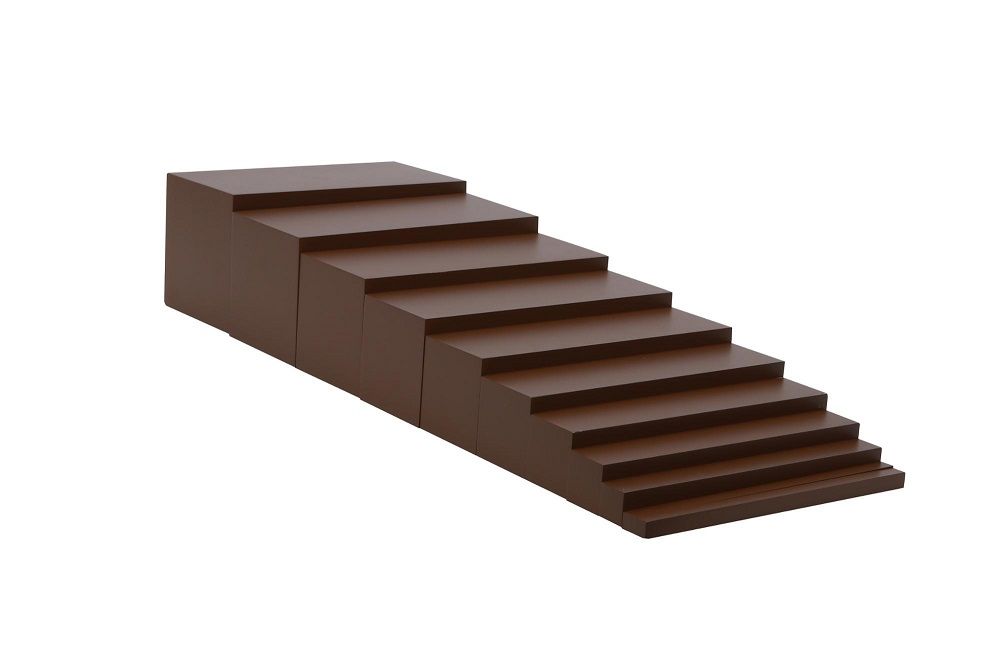Игрушечная лестница применяется на занятиях по методу Монтессори. 10 коричневых ступеней нужно расположить по мере возрастания ширины.