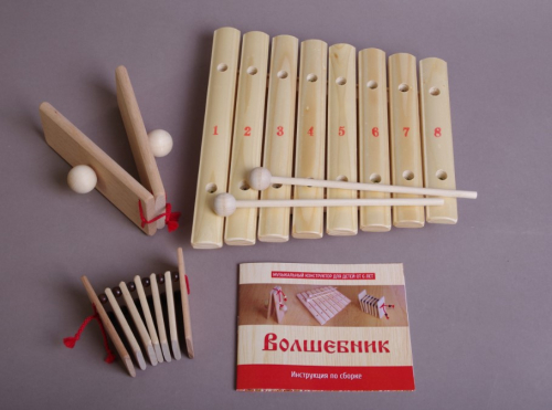 Музыкальный конструктор «Волшебник» состоит из деревянного набора музыкальных инструментов, которые предварительно нужно собрать.