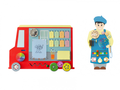 - фургон художника (750х520 мм) с карточками, циферблатом, тактильной дорожкой и бегунком, шестеренками, круговым элементом.