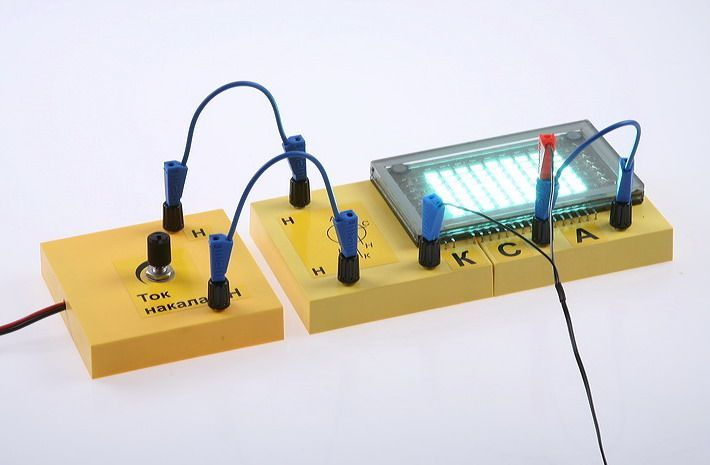 Набор для изучения тока в вакууме используется на уроках физики. Элементы оснащены магнитами, которые крепятся к доске в кабинете.