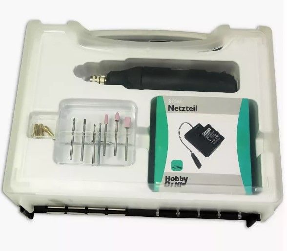 - мини-дрель (длина 140 мм, вес 80 г; для работы в комплекте с источником постоянного тока 3-12 В (модель P200, мощность 45 Вт, частота 12 000 об/мин), быстрозажимной патрон удерживает сверла диаметром 2,3 мм),