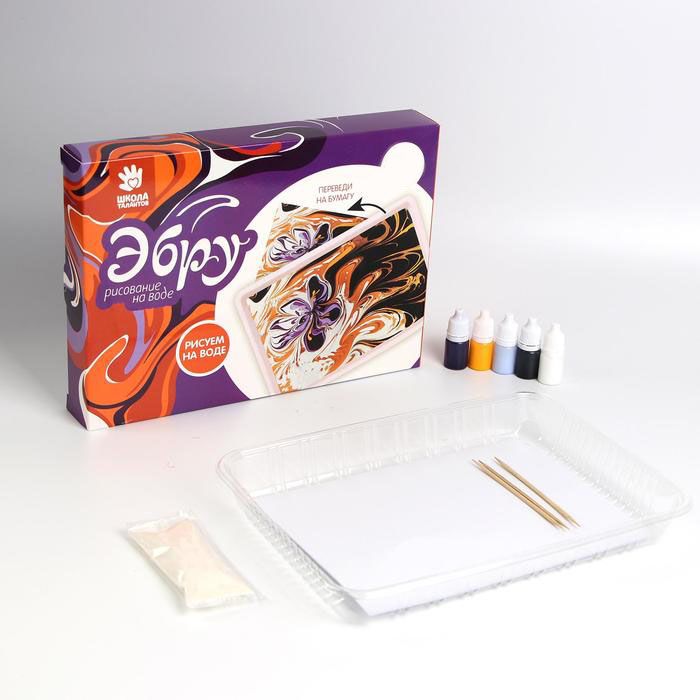В комплекте собраны инструменты для рисования по воде (с последующим перенесением рисунка на твердую поверхность). Дошкольники и младшие школьники создают изображения цветов. Эбру способствует развитию моторики рук и творческого мышления, эстетического восприятия мира. Приемы рисования и правила содержания красок изложены на упаковке.
