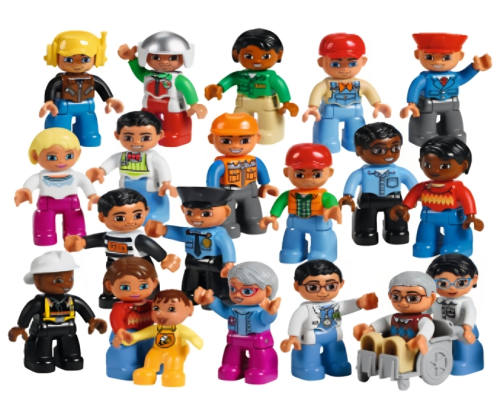 В комплекте представлены фигурки людей разных полов, возрастов и национальностей, одетые в повседневную одежду или профессиональную форму.