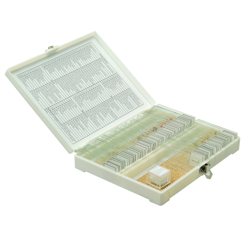 Микропрепараты имеют круглую форму. Каждый образец подписан. В состав также входят предметные и покровные стекла для самостоятельного изготовления препаратов.