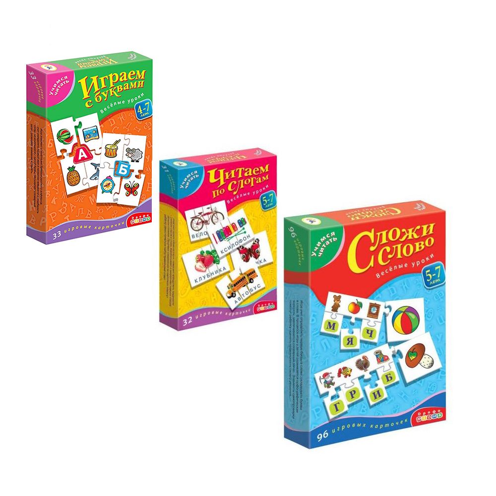| В комплекте 3 игры по темам | Сложи слово (37х196х280 мм, вес 0,19 кг),, Играем с буквами (230х235х50 мм, вес 0,44 кг),, Учимся читать (280х195х35 мм, вес 0,2 кг) |