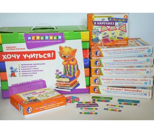 Пособия по русскому языку включают в себя карточки с заданиями. Рассматриваются поговорки и пословицы, созвучия, многозначные слова, синонимы и антонимы, паронимы, омонимы. Разбирается значение отдельных наречий.
