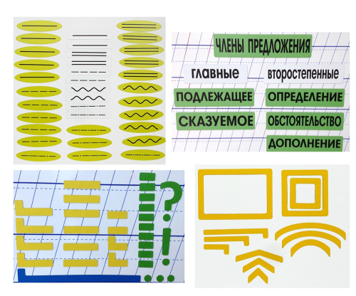 - «Разбор по членам предложения» — 35 магнитных карточек с изображением обозначений различных частей предложения. Подлежащее, сказуемое, дополнение – детям будет интересно находить и обозначать соответствующие части в заданном учителем предложении (Размер прямоугольных карточек: 22х150 мм, овальных карточек: 37х150 мм);