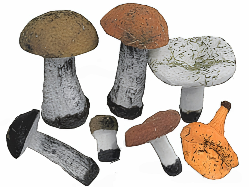 | В комплекте 6 муляжей | белый гриб,, малый белый гриб,, подосиновик,, подберезовик,, лисичка,, груздь |