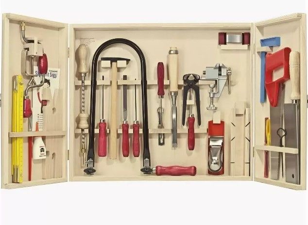 Набор инструментов в деревянном ящике поможет детям младшего школьного возраста познакомиться с основами столярного дела. Уроки труда и внеклассные творческие занятия станут интересными, занимательными и полезными, при этом риск получить травму сведен к минимуму. Все миниатюрные предметы, выполняющие те же функции, что обычные инструменты для взрослых, проверены и предназначаются специально для начинающих «мастеров».