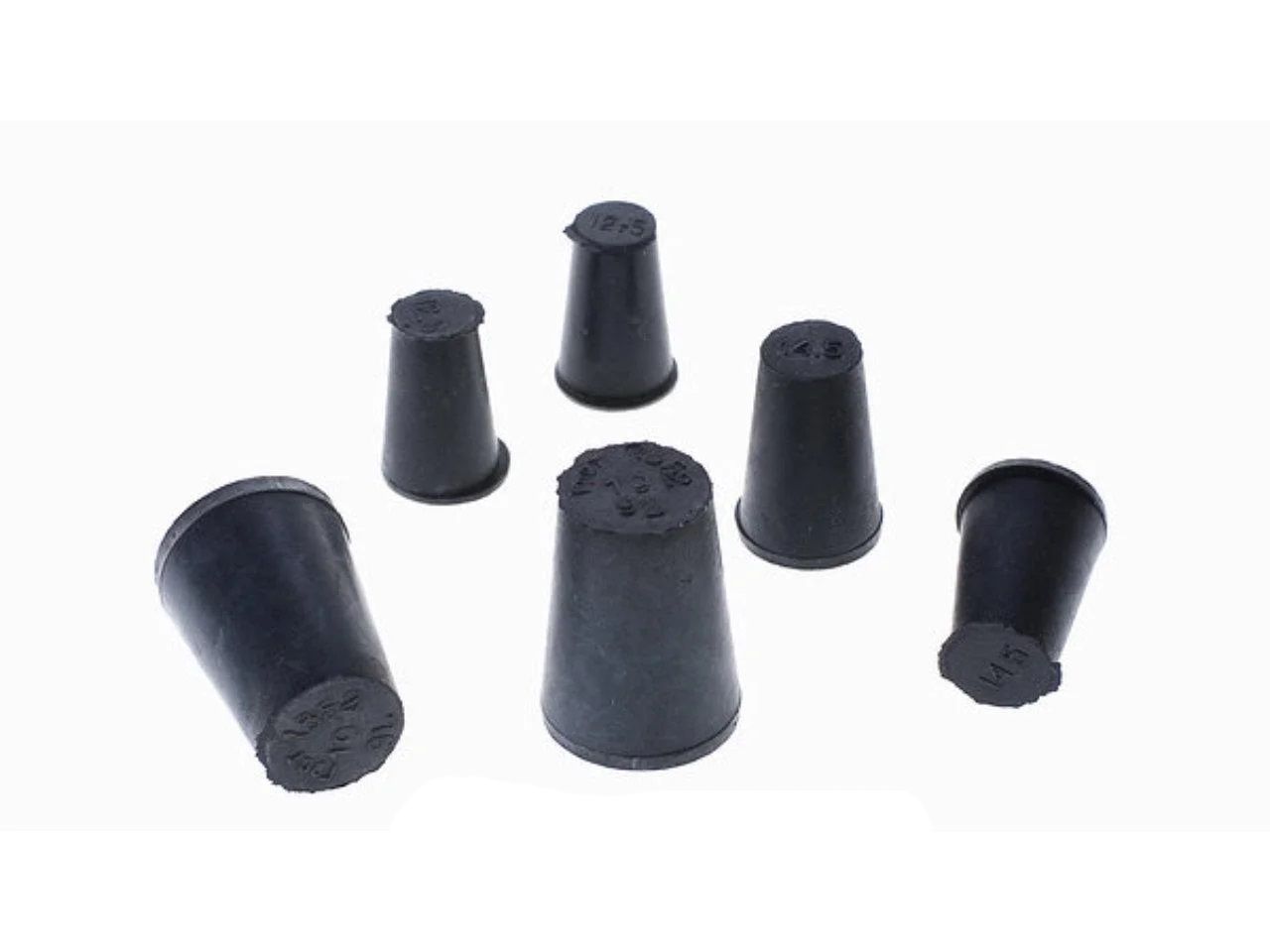Универсальный комплект резиновых пробок используется для закупорки специальной посуды в химической лаборатории.