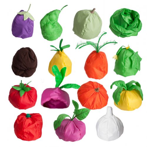 | Набор состоит из 15 шапочек с резинкой, выполненных в виде овощей | Баклажан;, Горох;, Кабачок;, Капуста;, Картофель;, Лук;, Морковь;, Огурец;, Помидор;, Редиска;, Тыква;, Репа;, Перец;, Свекла;, Чеснок |