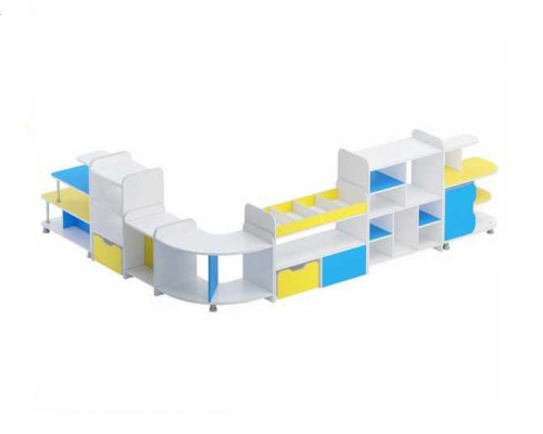 Края мебели обрамлены ПВХ-кромкой. Конструкция не имеет острых углов. Места для хранения игрушек и книг представлены открытыми полками.