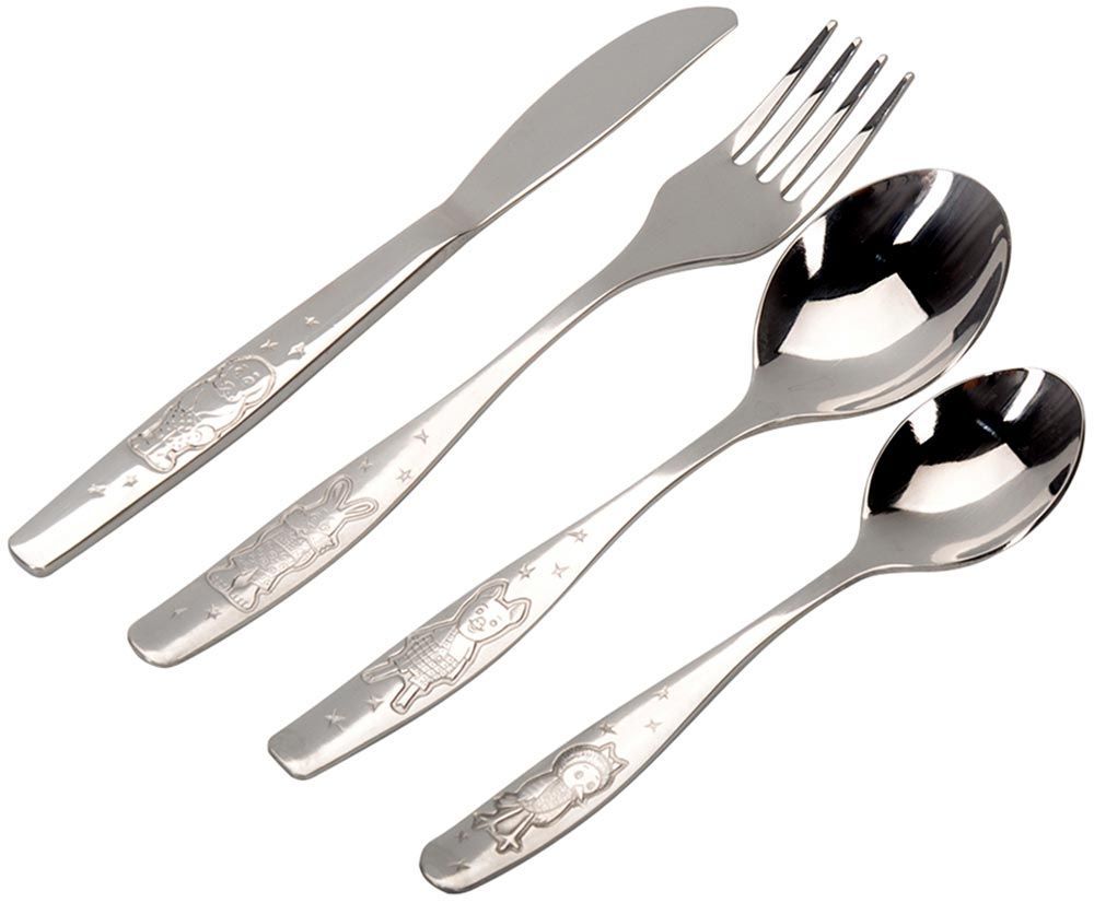 Набор используется в столовых ДОУ и школ. Штампованные изображения забавных животных создадут хорошее настроение перед приемом пищи. В составе 4 столовых прибора: чайная ложка, столовая ложка, нож и вилка.