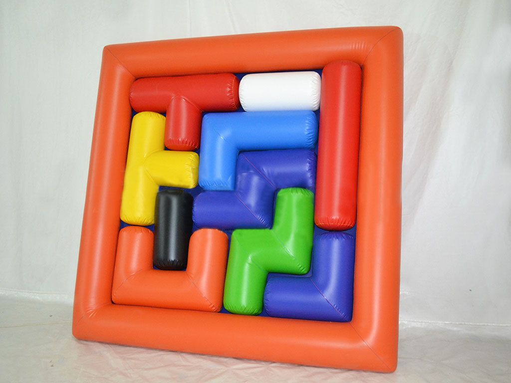 Герметичный каркас для игры на сообразительность надувается один раз. В прямоугольное поле вставляются детали, напоминающие части пазла из тетриса. Участник перемещает надувные элементы, пытаясь найти идеальное совпадение.