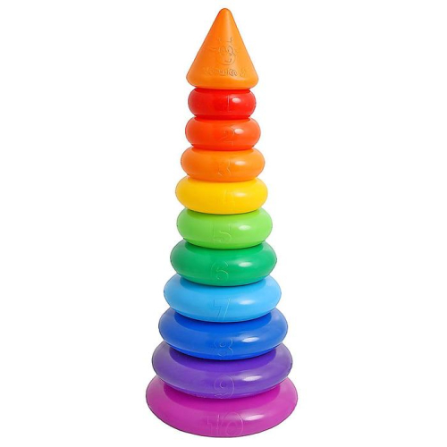 Напольная пирамида из 10 крупных элементов разных размеров 4-х основных цветов — это великолепная игрушка для дошкольников.